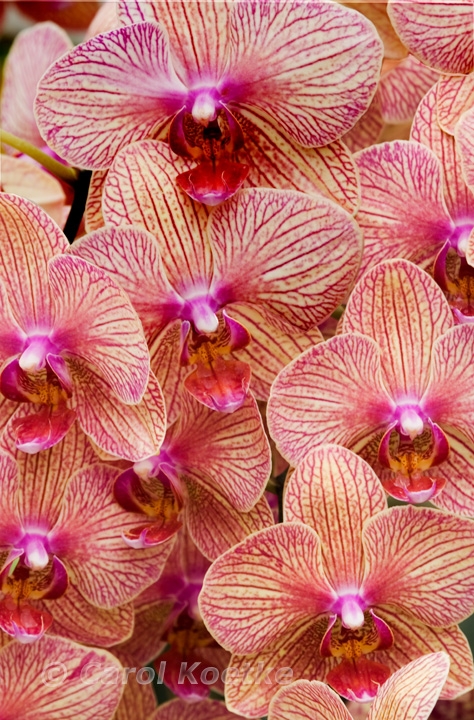 "Phals" are also known as "moth orchids" because the blossoms can resemble a cloud of moths hovering in the air. Most are easy to grow at home and they can remain in bloom for several months at a time. This hybrid specimen flowered profusely in a cascading cluster of candy-stripes. This photograph is printed on Museo Silver Rag photo paper using Ultrachrome pigment based inks and complemented with a soft-white mat. An optional black aluminum frame by Nielsen completes a piece of art that's ready to hang. This photograph is available in two sizes: 8"x12" matted to 12"x16" and 12"x18" matted to 18"x24". Carol Koetke Photography |
