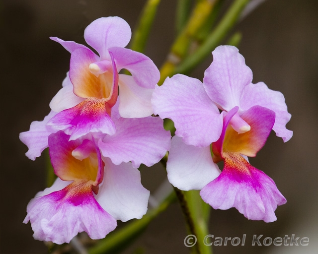 This orchid trio seemed to bring a smile to the face of everyone who looked at it. Who can miss the exuberant mood these fluffy, ruffled blossoms convey? What a wonderful example of the beauty of nature. The photograph is printed on archival Museo Silver Rag photo paper using Epson Ultrachrome pigment based inks and complemented with a soft-white double mat. An optional black aluminum frame by Nielsen completes a piece of art that's ready to hang. This photograph is available in two sizes: 8"x10" double matted to 11"x14" and 11"x14" double matted to 16"x20". Carol Koetke Photography |