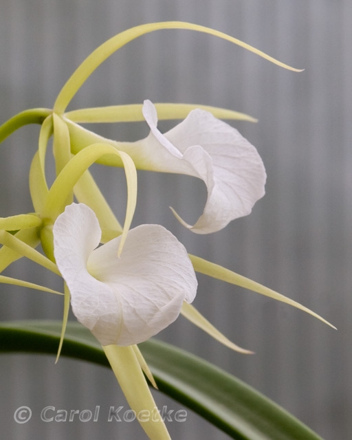Called “lady of the night” in its native Latin America, this graceful bloom (Brassavola nodosa) infuses the evening air with an exquisite perfume. This popular orchid is often recommended as a good plant for beginners to grow. This photograph is printed on archival Museo Silver Rag photo paper using Epson Ultrachrome pigment based inks and complemented with a soft-white mat with a black core. An optional black aluminum frame by Nielsen completes a piece of art that's ready to hang. This photograph is available in only one size: 8"x10" matted to 11"x14". Carol Koetke Photography |
