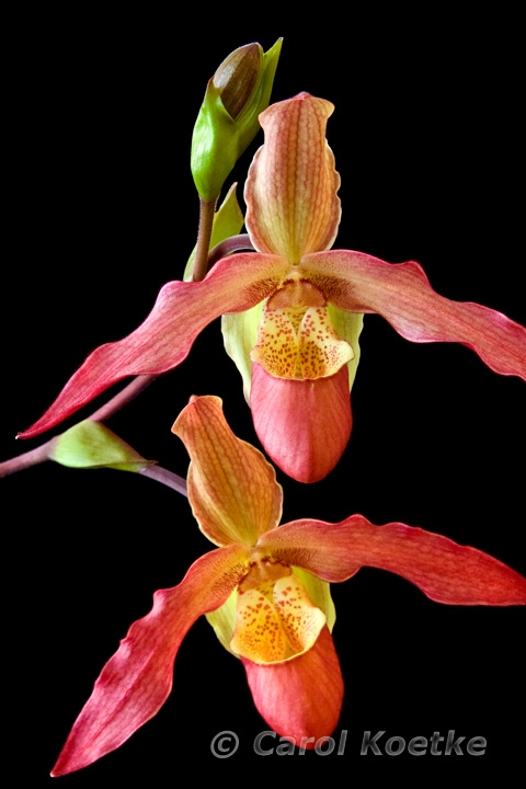 A Phragmipedium, often known as a slipper orchid, sends a tall stem from its fan of strap-like leaves. A stunning reddish “slipper” bloom develops at the end of the stem. As the bloom matures, the stem grows longer and supports a second bud that unfolds as the first flower fades. The specimen pictured produces a 3 foot stem with three to five large flowers. The photograph is printed on archival fine art photo paper using Epson Ultrachrome pigment based inks and complemented with a soft-white mat. An optional black aluminum frame by Nielsen completes a piece of art that's ready to hang. This photograph is available in two sizes: 8"x12" matted to 12"x16" and 12"x18" matted to 18"x24". Carol Koetke Photography |