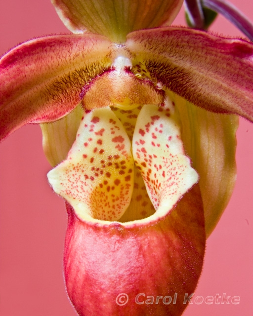 Phragmipediums, better known as a slipper orchids, have a devoted following among orchid growers and hobbyists. This Sorcerer’s Apprentice shows a reddish “slipper” bloom with its light gold pouch speckled with red—all of this designed to attract a bug into the pouch to complete pollination needed for reproduction. This photograph is printed on archival Fine Art photo paper using Epson Ultrachrome pigment based inks and complemented with a soft-white double mat. An optional black aluminum frame by Nielsen completes a piece of art that's ready to hang. This photograph is available in two sizes: 8"x10" double matted to 11"x14" and 11"x14" double matted to 16"x20". Carol Koetke Photography |