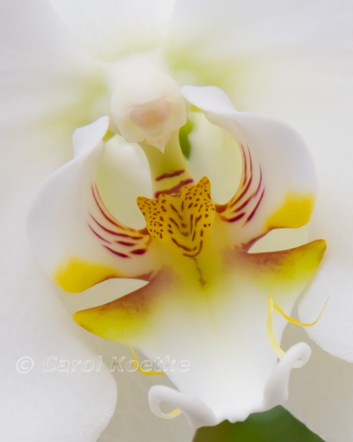 When you look deep into an orchid, you are likely to see a new set of colors, patterns, and textures. The incredible detail of the interior is always fascinating and often other-worldly. Next time you see an orchid, take a moment to look inside. This photograph is printed on archival Museo Silver Rag photo paper using Epson Ultrachrome pigment based inks and complemented with a soft-white double mat. An optional black aluminum frame by Nielsen completes a piece of art that's ready to hang. This photograph is available in only one size: 8"x10" double matted to 11"x14". Carol Koetke Photography |