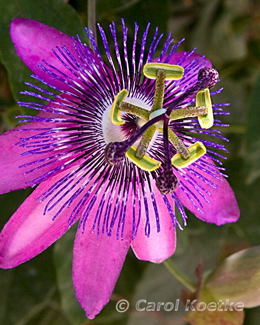 The Star of Bristol is one of more than 500 varieties of passion flower found throughout the world. The flower was known to natives in Peru and Brazil hundreds of years ago, yet new varieties are being hybridized today for flowers, foliage, and fruit. The petal colors of the Star of Bristol range from very light purple to the mid-violet shown in the photograph. The photograph is printed on archival Museo Silver Rag photo paper using Epson Ultrachrome pigment based inks and complemented with a soft-white mat. An optional black aluminum frame by Nielsen completes a piece of art that's ready to hang. This photograph is available in two sizes: 8"x10" matted to 11"x14" and 11"x14" matted to 16"x20". Carol Koetke Photography |